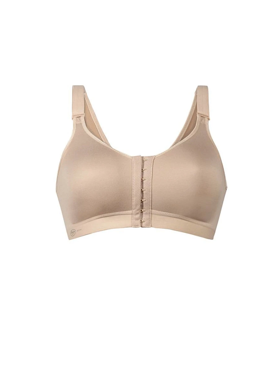 Anita Active Front Closure Sports Bra, available in Desert. This full cup, non wired sports bra has seamless pre-shaped cups to help shape and support the breast. The front fastener features a hook and eye closure and the fully adjustable straps are made with a velcro type fastener.