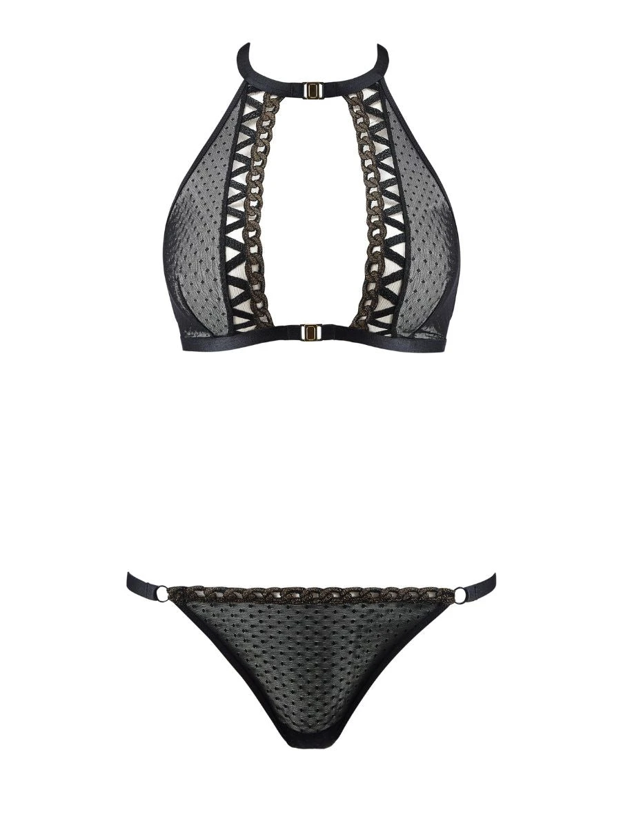 Indulge in luxury with the Aubade Boîte à Désir Unchain Me Up Set. This seductive set features a delicate chain detail and adjustable straps for a perfect fit. The bralette and matching tanga are made of sensual mesh, perfect for adding a touch of sexiness to your lingerie collection. One size fits all, making it a must-have for every elegant and exclusive wardrobe.