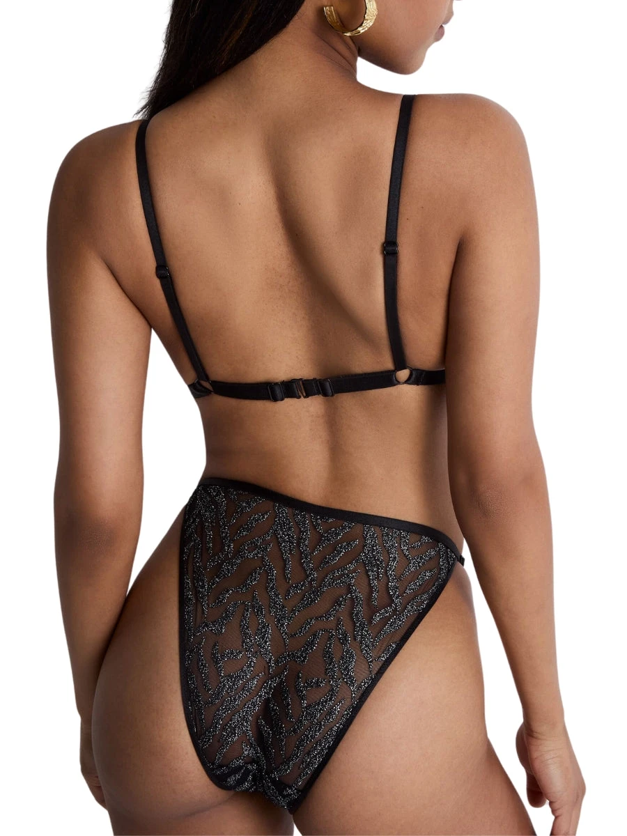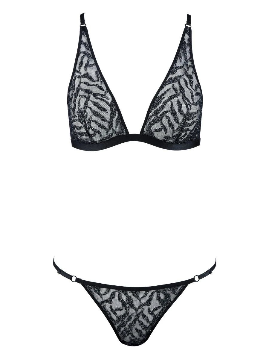 Indulge in luxury with the Moonlight Shadow Set from Aubade. This exquisite lingerie set includes a sensual mesh bralette and a strappy brazilian style brief, adorned with glitter accents. One size fits all, and adjustable straps ensure a perfect and comfortable fit. Elevate your lingerie collection with this exclusive and alluring set.