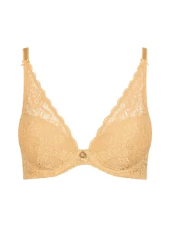 Introducing the Rosessence Care High Apex Plunge Bra in Sunshine by luxury brand Aubade. Featuring a deep plunge and high apex, this padded bra is adorned with a delicate lace overlay for a sophisticated touch. Elevate your lingerie collection with this exclusive and elegant piece.