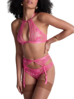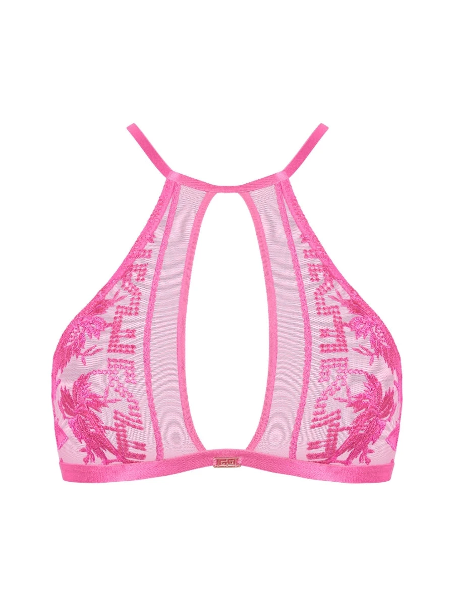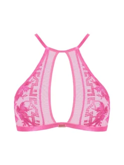 Indulge in the exquisite luxury of Aubade’s Rules of Attraction Bralette in Exciting Pink. This non-padded, non-wired bralette features intricate French embroidery, a unique high neck design, and a daring plunging neckline. With a sheer tulle and racerback style straps, this piece exudes sensuality and sophistication. Elevate your lingerie collection with this sexy and elegant bralette.