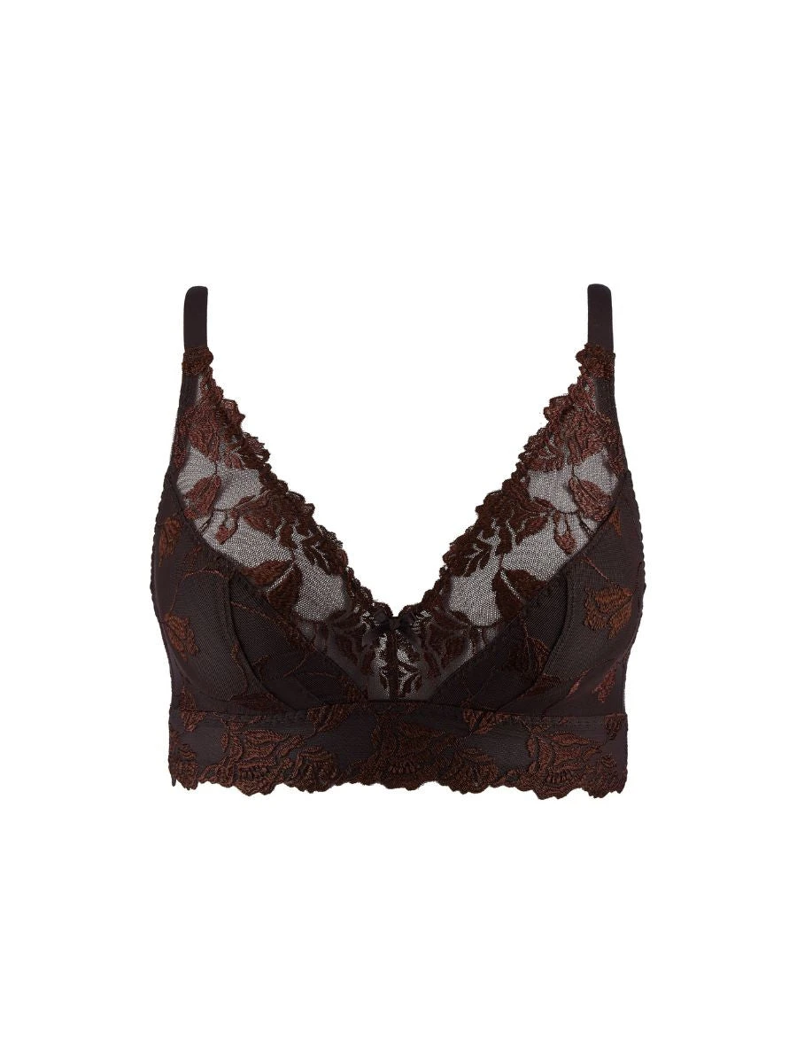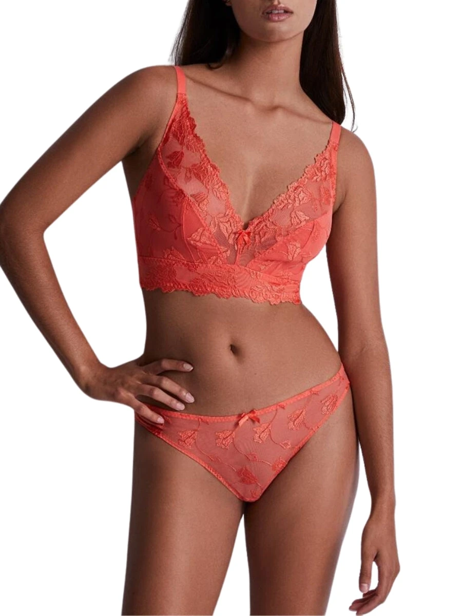 Indulge in the luxurious Softessence Triangle Bralette by Aubade. This non-wired and padded bralette features recycled floral embroidery for a unique touch. Its plunge design and longline silhouette provide a sensual look, while the wide back offers both support and comfort. Experience elegance and premium quality with this exclusive piece.