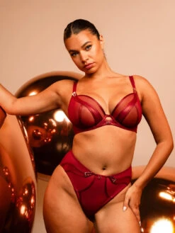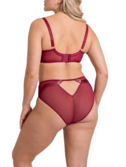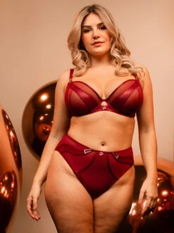 The Suspense Plunge Bra in Sangria by Scantilly from Curvy Kate offers expert design with a deep plunging neckline and underwired support for enhanced shape. Crafted without padding, it features curve-contouring shimmering panels combined with sheer mesh and satin-finish sections, creating a sophisticated and sexy silhouette. Accented with elegant rose gold hardware, this bra balances allure and structure for confident wear.