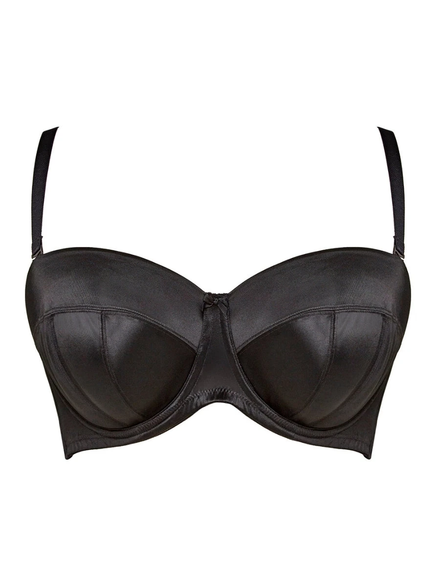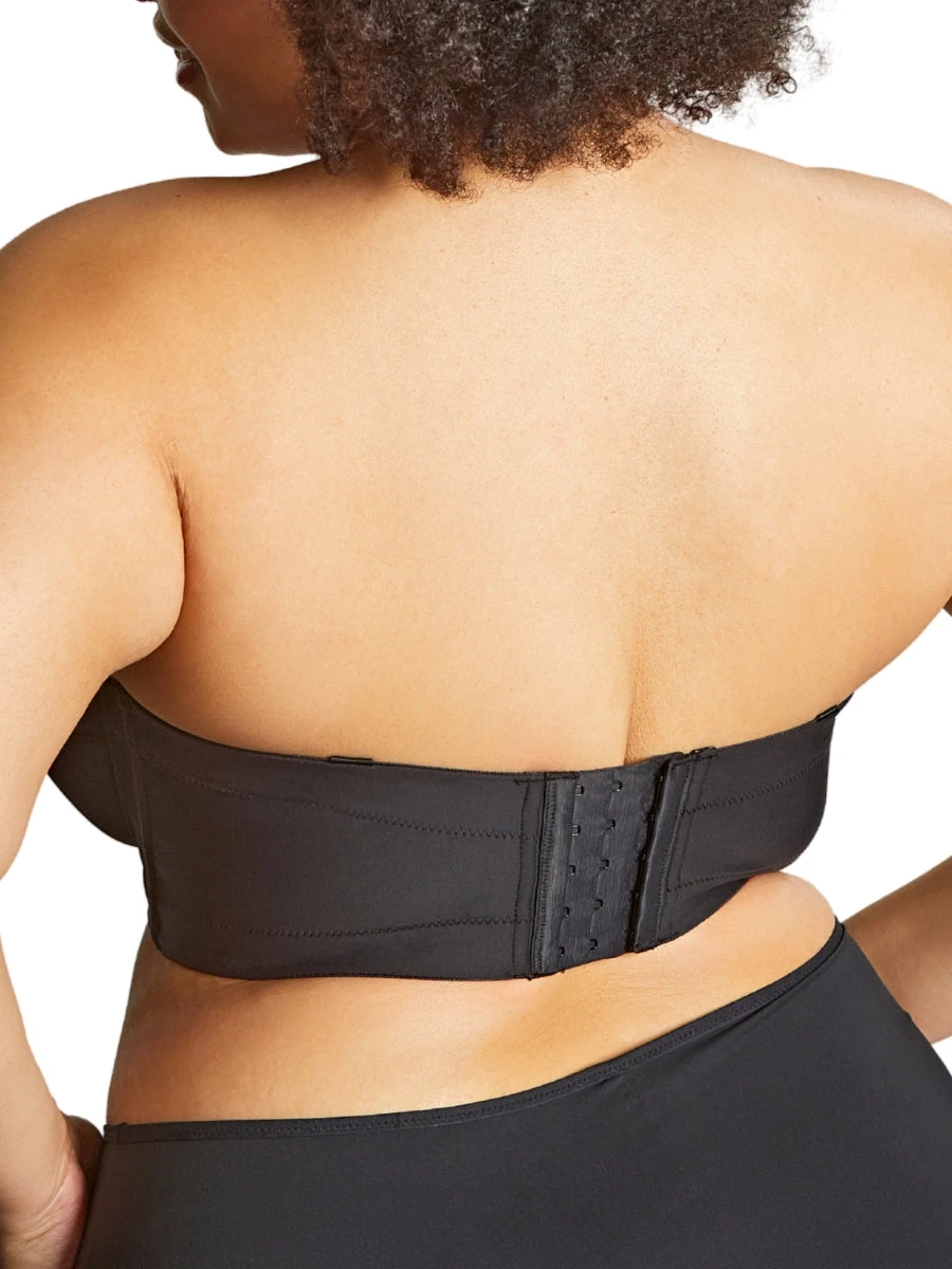 Introducing the Dana Balcony Strapless Bra in Black from Sculptresse by Panache. With a supportive four piece padded cup and silicone elastics, this bra stays in place all day long. The detachable multiway straps offer versatility for any outfit, while the wide back band and double layer wings provide extra softness and a smoothing effect. Feel secure and uplifted without straps, thanks to the plastic bones in the side seams. Elevate your lingerie collection with this luxurious and exclusive piece.