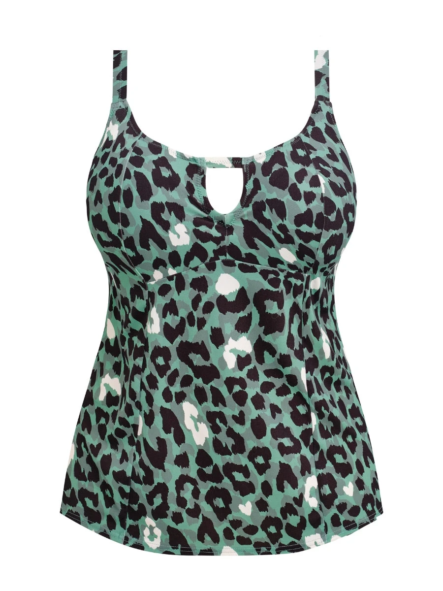 Introducing Jungle Bay Tankini Top in Olive by Elomi. This luxurious non-wired swimwear piece features lightweight foam moulded cups and a centre keyhole cut out for a sophisticated touch. Its gently flared design adds a touch of elegance, while the animal print exudes exclusivity. Dive into luxury with this must-have piece.