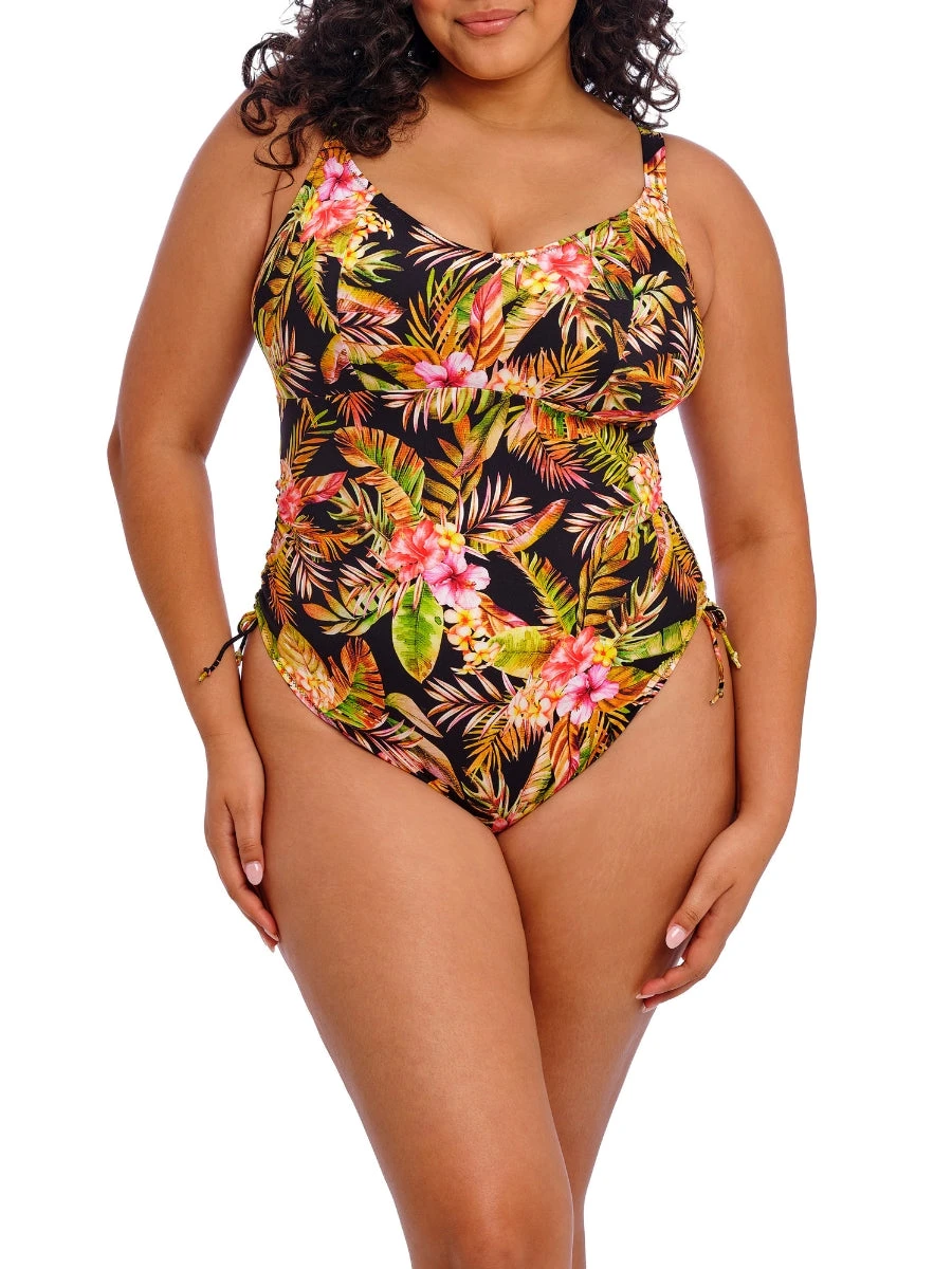Elevate your swimwear collection with the Tiger Valley Non Wired Swimsuit from luxury brand Elomi. This one piece features adjustable side ties for customizable coverage and a supportive, in-built shelf bra. Made with lightweight lycra material, it boasts a tropical leaf print for a touch of elegance.