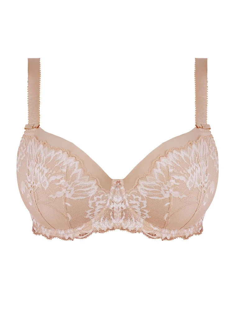 Fantasie Aubree Half Cup bra in Natural Beige. Featuring lightly padded cups for everyday support with feminine floral lace. Finished with a tear drop charm on the centre front.