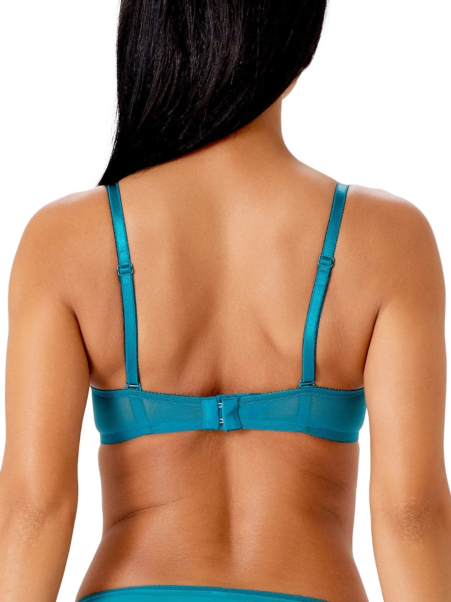 This Sheer Bra in Deep Teal offers a deep plunge neckline and seamless, moulded cups. Finished with a gold signature plate detailing. Matches perfectly with either the Glossies Lace Thong or the Glossies Lace Brief.