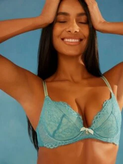 Fashioned from beautiful corded stretch lace is Gossard’s Superboost Lace Padded Plunge Bra in Ocean Blue.