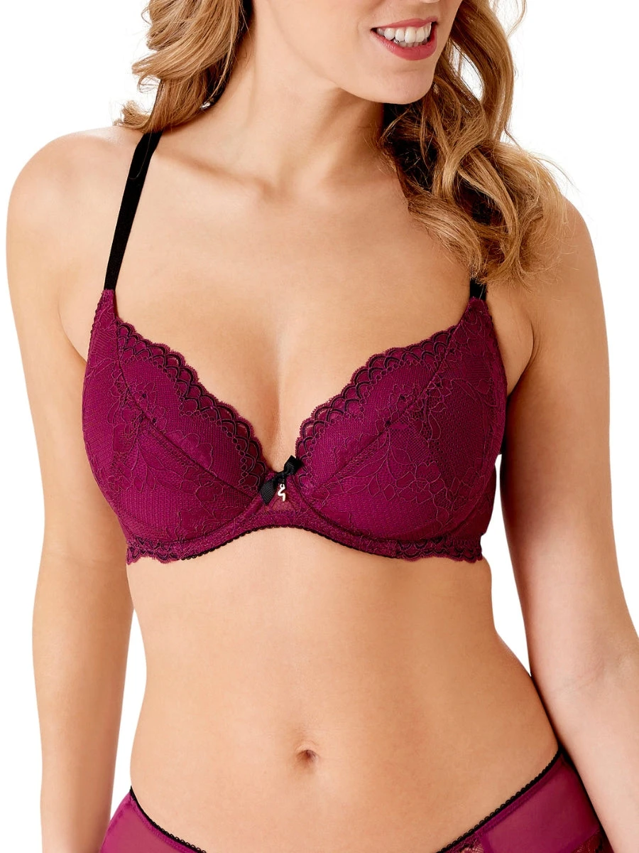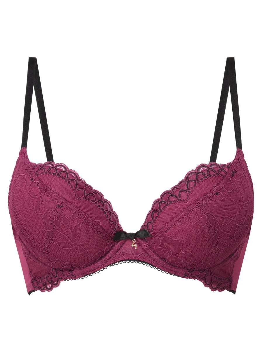Fashioned from beautiful corded stretch lace is Gossard’s Superboost Lace Padded Plunge Bra in Purple Potion.