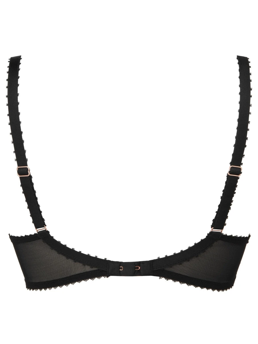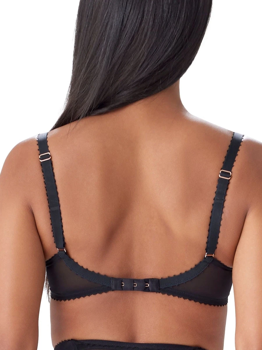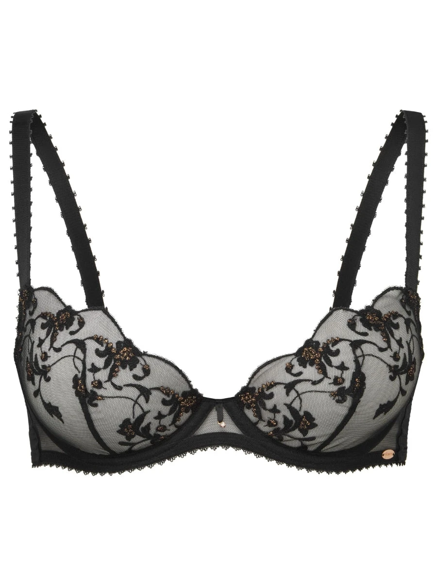 Experience sheer, sexy elegance with the VIP Taboo Balcony Bra in black from luxury brand Gossard. The low cut and balcony design create a seductive silhouette, while intricate embroidery and a diamante stone center add a touch of sophistication. Non-padded for a natural look and feel.