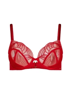 Indulge in luxury with the Viva Plunge Bra in Tango Red by Gossard. This underwired, sheer bra features delicate embroidery and embellishment, along with a sleek satin sling and golden hardware. Perfect for a sophisticated and exclusive look.