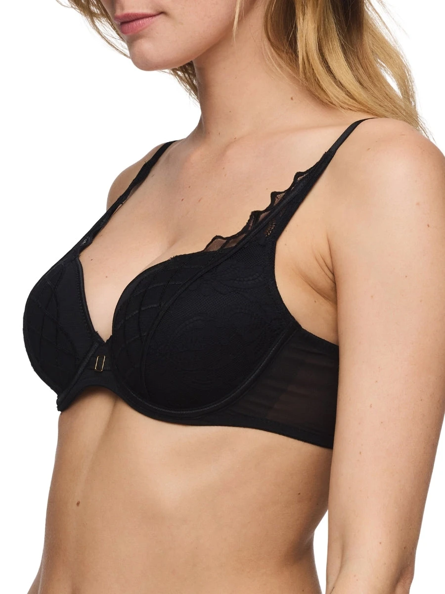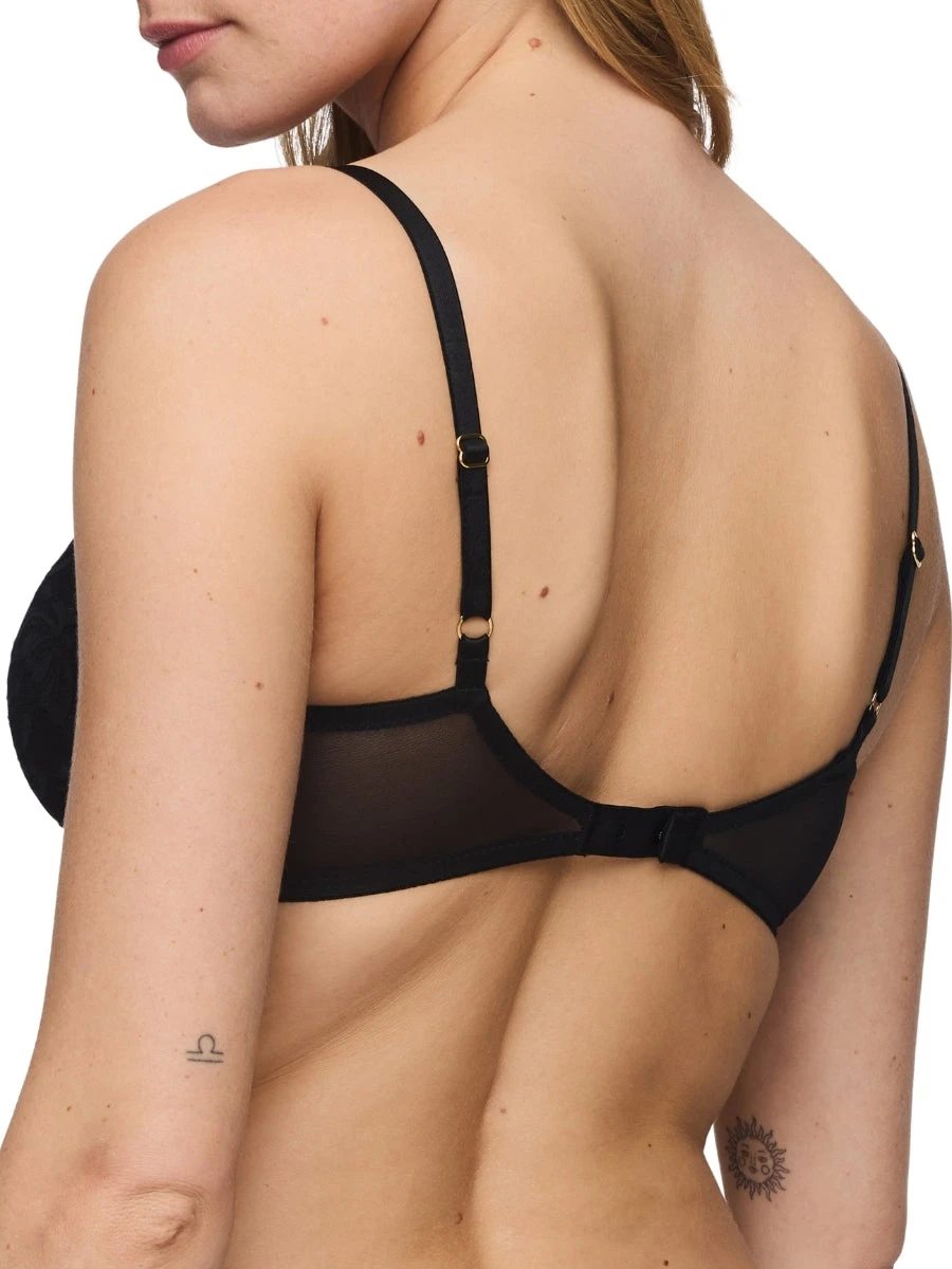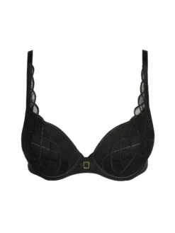 Introducing the Aven Padded Heartshape Bra in Black, brought to you by luxury lingerie brand Marie Jo. This underwired bra features padded and moulded cups, creating a flattering and supportive fit. The plunge neckline and sheer mesh overlay add a touch of seductive appeal, while delicate embroidery adds a touch of sophistication. Enhance your curves and confidence with this exclusive piece.