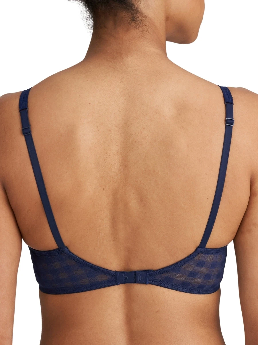Introducing the Jereme Half Padded Plunge Bra by luxury brand Marie Jo. Experience ultimate support and comfort with the underwired and half padded design. The elegant check print and sheer mesh add a touch of sophistication to this Sapphire Blue bra. Upgrade your lingerie collection with this exclusive piece.