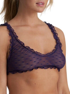 Indulge in luxurious style with the Tulio Bralette Top from brand Marie Jo. This sheer, mesh top features delicate polka dots and a frill edge for a stunning look. Wear it with or without a bra for versatility and an effortlessly chic vibe. Available in Majestic Purple.